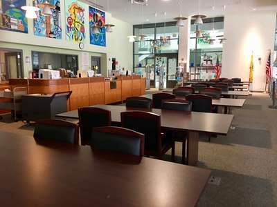 Library is equipped with tables, chairs, computers, and a projector screen. This space is perfect for large meetings, classes, and tests.