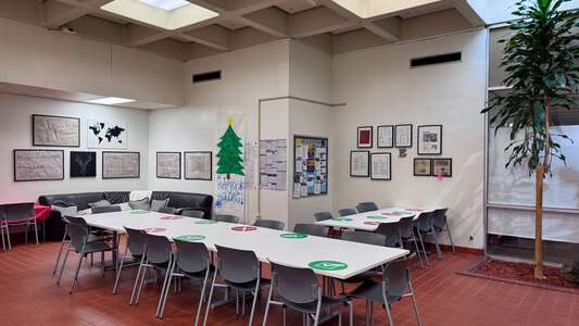 The Faculty lounge is equipped with tables, chairs, computers and a TV. This space is perfect for meetings, classes, and tests.