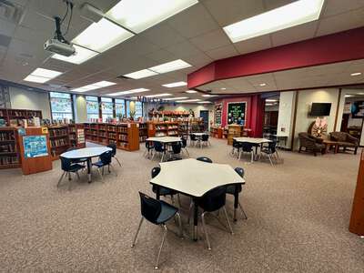 The Library is perfect for large meetings, classes, and tests. It is equipped with tables, chairs, computers, and a projector screen.